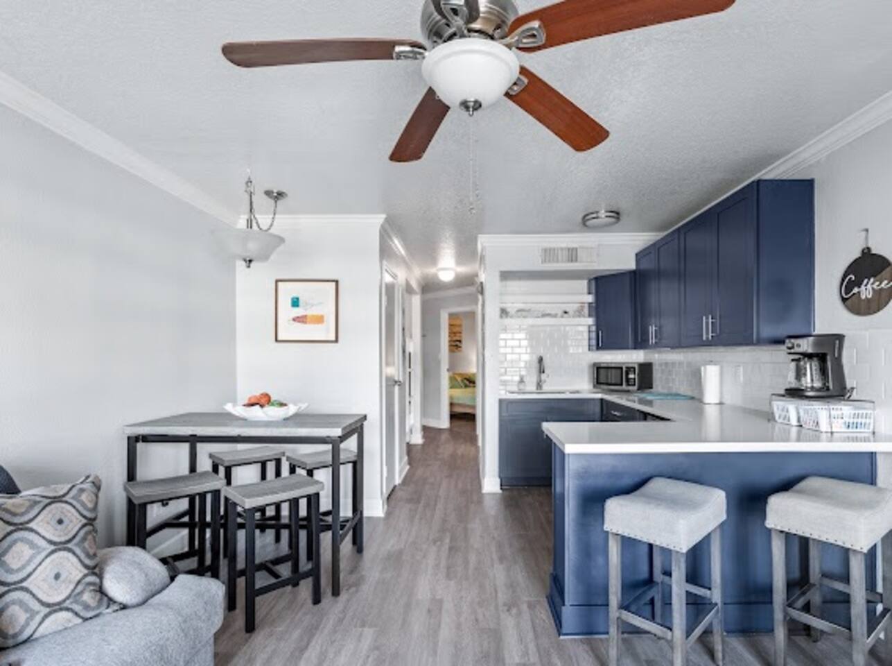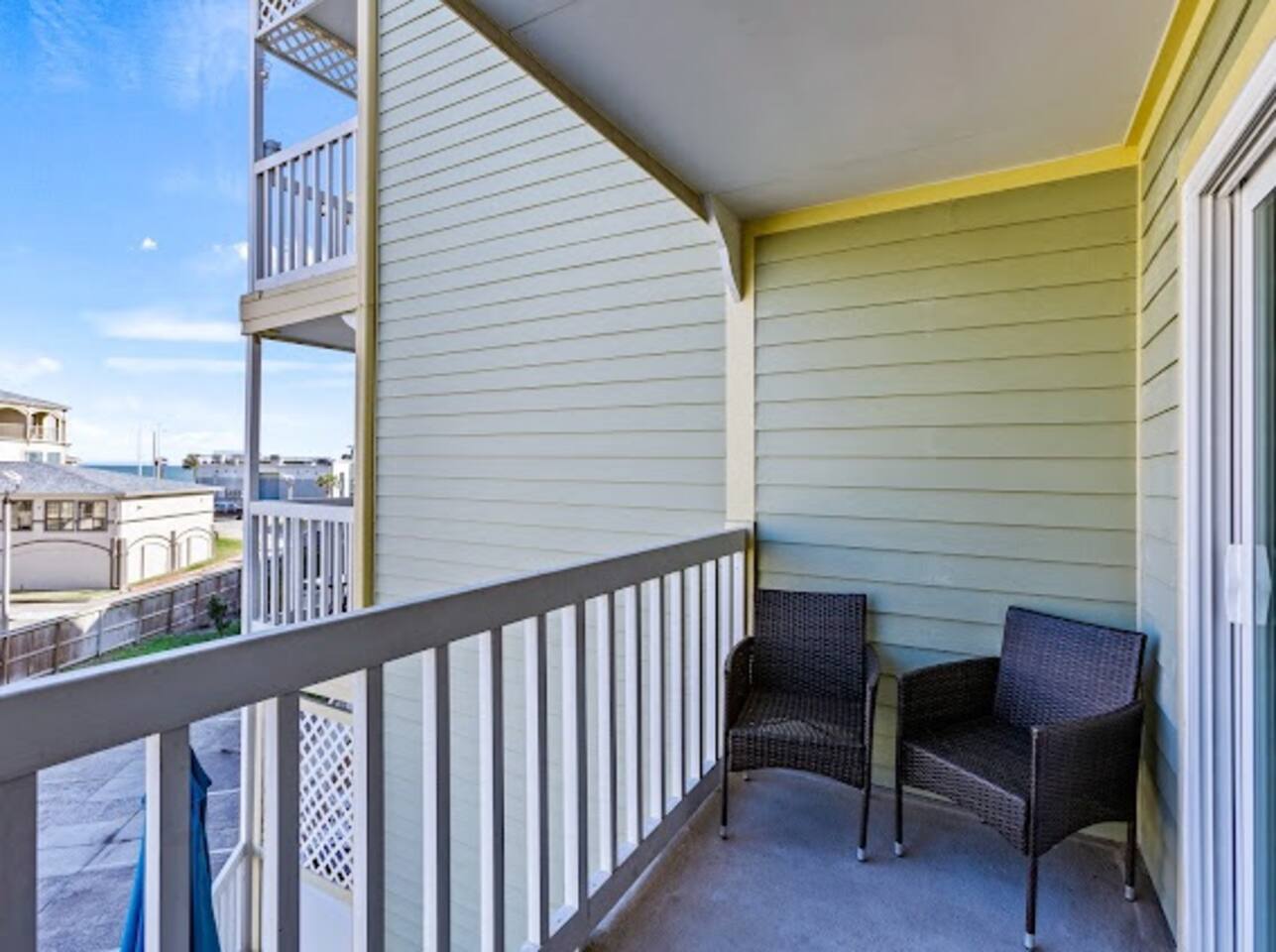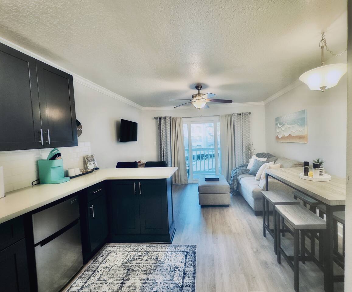 10% discount for week long stays!! This completely renovated, stylish, second floor condo has slightly obstructed views of the ocean. >One bedroom with a full size bed, memory foam mattress topper >Set of bunk beds in the hallway >Bathroom with shower/tub combo >Kitchen contains mini fridge, crockpot, Keurig coffeemaker, plug in cooktop, microwave and small air fryer >Modern cabinetry with spacious countertops and plenty of storage >Bar setup perfect for socializing >Large drop-in sink >Living room with cozy couch, Roku TV, and DVD player with small selection of DVDs >Brand new sliding glass door that filters sound and provides insulation during cool nights/warm summer days >Pack light, we provide beach towels!