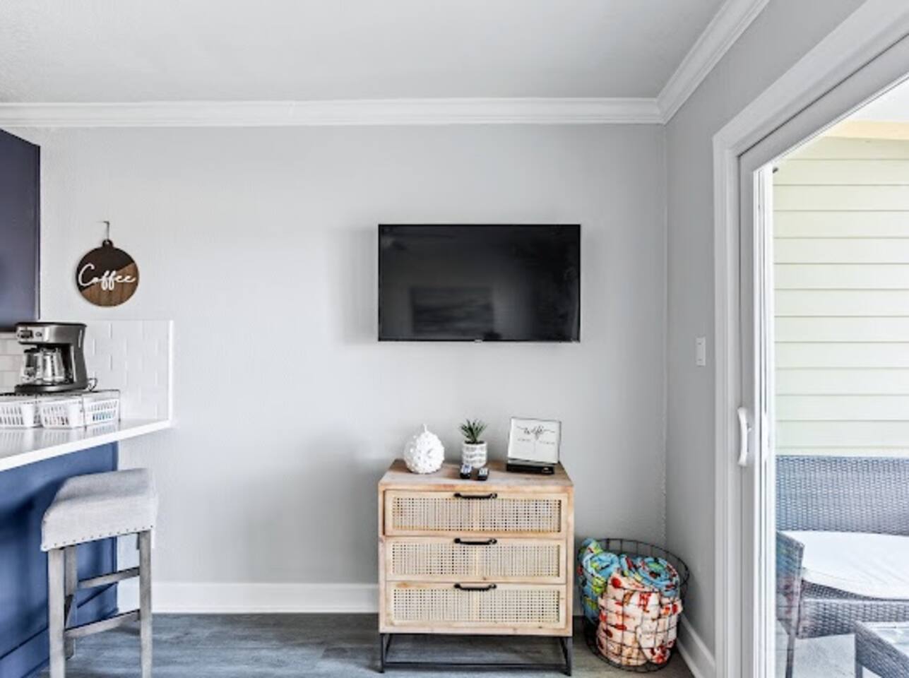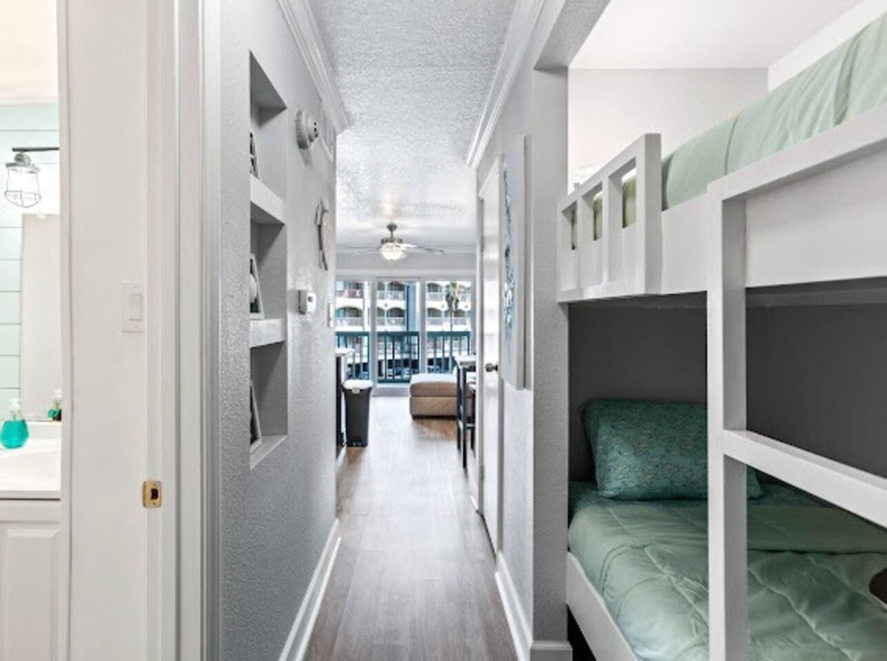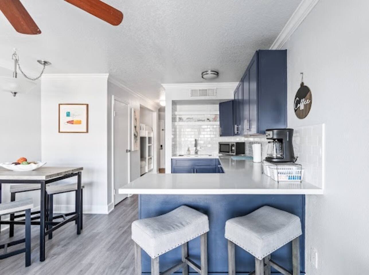 10% discount for week long stays!! This completely renovated, stylish, second floor condo has slightly obstructed views of the ocean. >One bedroom with a full size bed, memory foam mattress topper >Set of bunk beds in the hallway >Bathroom with shower/tub combo >Kitchen contains mini fridge, crockpot, Keurig coffeemaker, plug in cooktop, microwave and small air fryer >Modern cabinetry with spacious countertops and plenty of storage >Bar setup perfect for socializing >Large drop-in sink >Living room with cozy couch, Roku TV, and DVD player with small selection of DVDs >Brand new sliding glass door that filters sound and provides insulation during cool nights/warm summer days >Pack light, we provide beach towels!